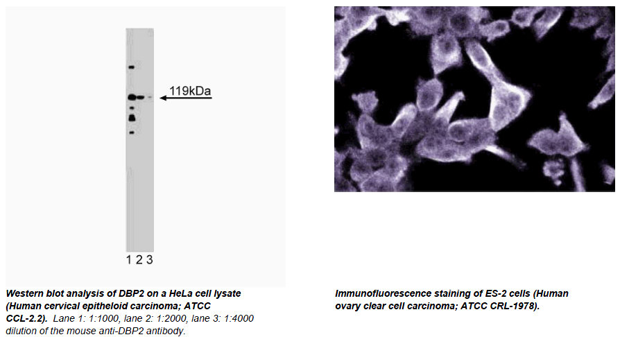 DBP2 is expressed in a wide range of human tissues with highest expression in heart, skeletal muscle, and testis. In HeLa cells, DBP2