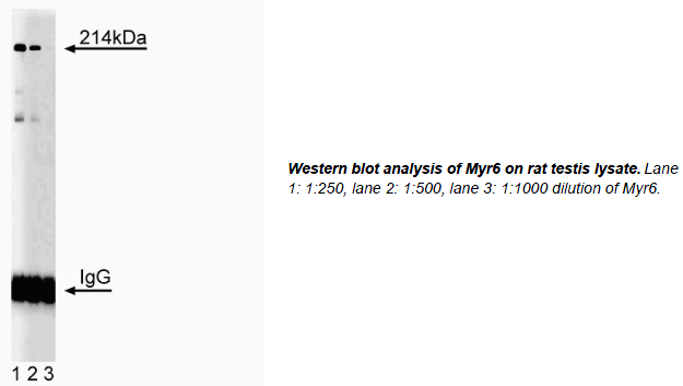 C-terminal tail that is homologous to dilute myosin, AF-6, and GAD. Myr 6 is expressed highly in mouse heart, kidney, testis, liver, and lung.