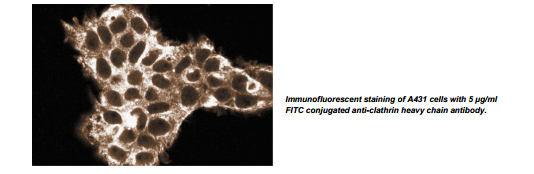 Clathrin is the major protein component in the coat formed around pits and vesicles involved in receptor-mediated endocytosis. Clathrin forms a non-covalently bound triskelion structure composed of three heavy chains (192 kDa each) and three light chains (23-25 kDa each). Each leg of the triskelion structure contains one heavy and one light chain. The three heavy chains forming the triskelion structure are attached at their respective proximal ends like spokes on a wheel. Clathrin heavy chain is composed of a terminal globular domain, a distal segment containing several areas sensitive to enzymatic cleavage, and a proximal segment which contains a light chain binding site. The proximal and distal domains are connected by a joint segment at which there is a sharp bend in the heavy chains of fully-assembled triskelia. Although the calculated molecular weight is 192 kDa, clathrin heavy chain migrates at approximately 180 kDa.