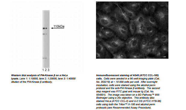 Phosphoinositide turnover is a well established mechanism of intracellular signal transduction. Sequential phosphorylation of phosphatidylinositol (PtdIns) results inPtdIns-4-phosphate (PIP) and PtdIns-4,5-bisphosphate (PIP2). Phospholipase C (PLC)hydrolyzes PIP2 to inositol-1,4,5-trisphosphate (IP3) which stimulates release of intracellular Ca2+. PIP is generated by phosphorylation of PtdIns at the D4 position of the inositol ring. This event is mediated by the PtdIns 4-kinases (PI4-K). These enzymes are divided into two types (II and III) based on their size and sensitivity to certain compounds. Although the PI4-Ks are abundantly distributed throughout the cell, activity is found primarily in association with membranous structures. Members of this family contain a lipid kinase unique domain and a C-terminal catalytic domain. Two mammalian PI4-Ks, PI4-Kα and PI4-Kß, have been identified. PI4-Kß is homologous to the yeast PI4-K, PIK1. Based on its size and sensitivity to wortmanin (a PI3-K inhibitor), PI4-Kß is classified as a type III enzyme. Although it is found in the cytosol and in association with the Golgi, the specific function of PI4-Kß is yet to be determined.