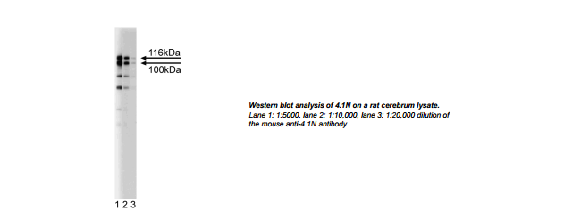 The erythrocyte membrane cytoskeletal protein, 4.1R, is an important structural element of red blood cells. It contains a spectrin-actin-binding domain (SABD) that facilitates spectrin interaction with F-actin and a membrane-binding domain (MBD) that links the cytoskeleton to the plasma membrane via interactions with Band 3 protein. Two homologues of 4.1R, 4.1G and 4.1N, are expressed throughout the body and in neurons, respectively. These 4.1 proteins contain Ca2+-dependent (CD-CaM) and Ca2+-independent calmodulin (CI-CaM) binding sites within the MBD domain, a centrally located SABD, and a conserved C-terminal domain (CTD). 4.1N expression is high throughout the adult brain and lower in heart, kidney, and pancreas. In neurons, 4.1N protein co-localizes with PSD-95 and GluR1 at sites of synaptic contacts and the CTD of 4.1N allows binding to the C-terminus of GluR1. In addition, 4.1N interacts with the PI3-Kinase enhancer (PIKE) protein and translocates to the nucleus along with PIKE in response to NGF treatment. Thus, 4.1N is a neuronal membrane cytoskeletal protein that may be involved with localizaton of proteins such as neurotransmitter receptors and signaling molecules. Predominant isoforms of 4.1 proteins have been reported to be observable between 30-210 kD due to complex alternative splicing events. 4.1N has been reported to be observable in a range of 100-135 kD in neuronal populations.
