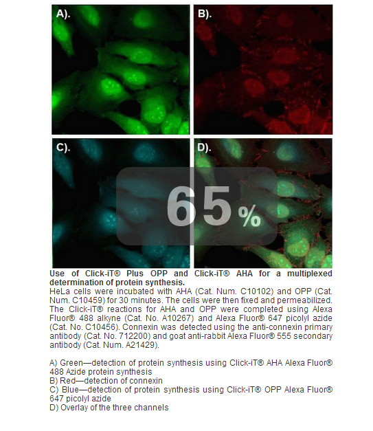 The Click-iT® Plus OPP Alexa Fluor® 647 Protein Synthesis Assay Kit provides a fast, sensitive, and non-radioactive method for the detection of protein synthesis using fluorescence microscopy or high-content imaging. In this assay O-propargyl-puromycin (OPP) is efficiently incorporated into newly translated proteins in complete methionine-containing media and fluorescently labeled with a bright, photostable Alexa Fluor® dye in a fast, highly-specific, and mild click reaction.