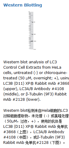 Hela细胞总裂解液经 50μM 氯喹过夜处理或未经处理。加入SDS上样缓冲液。在原管中煮沸2分钟,微型凝胶孔上样10μl/孔。Western Blots:CST建议加样前将细胞提取物煮沸2分钟。每孔加入10µl细胞样品。自噬是自噬溶酶体对其包裹的细胞质内含物进行降解的一种分解代谢过程(1,2)。自噬过程一般是在营养匮乏的条件下被激活,但是也与一些生理过程有关,如发育、分化、神经变性、感染和癌症(3)。自噬微管相关蛋白的轻链3(LC3)最初被认定为是微管相关蛋白1A和1B的一个亚基(被称为MAP1LC3)(4),随后发现该蛋白所包含的与酵母蛋白类似的Apg8/Aut7/Cvt5对于自噬起着至关重要的作用(5)。三种人类LC3亚型(LC3A、LC3B和LC3C)在自噬过程中翻译后被修饰(6-9)。随着合成后LC3羧基末端迅速裂解,产生了胞浆的LC3-I 型。在自噬过程中,通过一个涉及Atg7和Agt3的类泛素体系,LC3-I被脂质化为LC3-II,从而将LC3与自噬小泡联系起来(6-10)。自噬体中LC3的存在,及其向低迁移形式的LC3-II的转化被作为自噬发生的“指示器”(11)。
