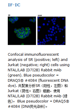 NTAL/LAB (D7I2B) Rabbit mAb 能顾检测内源性水平的NTAL/LAB 总蛋白。此单克隆抗体通过合成肽免疫动物制备,这种合成肽是人源NTAL/LAB 蛋白Gly222周围的肽段。非T细胞活化连接蛋白(NTAL)/B细胞激活连接蛋白(LAB)是个小的跨膜接头蛋白,与糖脂丰富的细胞膜片段相连(1,2)。 NTAL/LAB 也被称作 LAT2 (连接活化T 细胞 2)、WBSCR5、WBS15、WBSCR15 (Williams-Beuren 综合症染色体区域15蛋白)。 NTAL/LAB在B 细胞、单核细胞、肥大细胞和自然杀伤细胞中表达, 但是在静息 T 细胞中不表达 (3)。除了激活一些受体外, NTAL/LAB 也能使酪氨酸磷酸化并招募信号分子Grb2 和 c-Cbl组成信号受体复合体(4-6)。