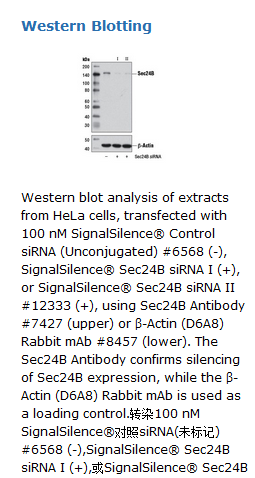 SignalSilence® Sec24B siRNA I from Cell Signaling Technology (CST) allows the researcher to specifically inhibit Sec24B expression using RNA interference, a method whereby gene expression can be selectively silenced through the delivery of double stranded RNA molecules into the cell. All SignalSilence® siRNA products from CST are rigorously tested in-house and have been shown to reduce target protein expression by western analysis.