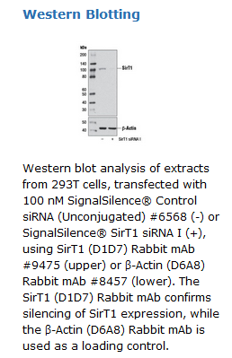 SignalSilence® SirT1 siRNA I from Cell Signaling Technology (CST) allows the researcher to specifically inhibit SirT1 expression using RNA interference, a method whereby gene expression can be selectively silenced through the delivery of double stranded RNA molecules into the cell. All SignalSilence® siRNA products from CST are rigorously tested in-house and have been shown to reduce target protein expression by western analysis.