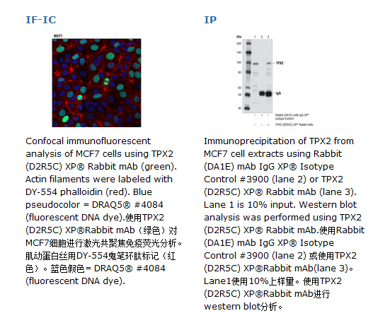 .TPX2 (D2R5C) XP® Rabbit mAb可以识别内源性TPX2总蛋白。单克隆抗体由合成肽段免疫动物产生,该肽段与人TPX2的420位赖氨酸邻近残基序列一致。核膜形成,有丝分裂纺锤体的聚集以及核转运过程都涉及了Ras家族小GTPase Ran蛋白(1.2)。TPX2,活化Ran(RanGTP)的一个靶蛋白是一个微管核形成蛋白。TPX2与细胞核输入-alpha结合时是失活状态。RanGTP的活性能够破坏这种结合,减弱TPX2的抑制作用(3)。TPX2的结合会激活Aurora A激酶促进其定位到有丝分裂的纺锤体(4,5)。有丝分裂时DNA损伤会丢失Aurora A和TPX2的结合从而使Aurora 激酶失活(6)。TPX2在胰腺癌细胞中高表达,敲除TPX2会增强细胞对紫杉醇的敏感性(7)。