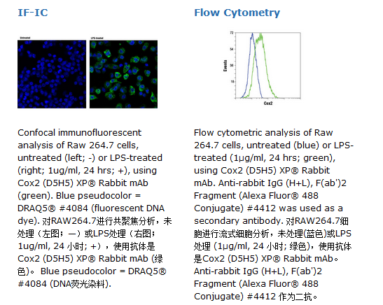 Cox2 (D5H5) XP® Rabbit mAb兔单抗能够检测内源性Cox2总蛋白水平。此单克隆抗体通过合成肽免疫动物制备,这种合成肽与人源Cox2蛋白His108周围残基相一致。环氧合酶1(Cox1) 和环氧合酶2 (Cox2)与人源的同系物有60%的相似度,能够促进前列腺产生花生四烯酸(1,2)。 在大多数的组织中Cox1是组成型表达, Cox2 的表达要通过脂多糖(LPS) 和肽聚糖 (PGN)的诱导(3)。 PGN 激活 Ras, 导致了Raf 在 Ser338位点 和 Erk1/2 在 Tyr204位点的磷酸化。MAP 激酶信号通路的激活引起随后的IKKα/β的激活、IκBα在 Ser32/36位点的磷酸化和 NF-κB 的激活。 最终, 转录调控因子NF-κB的激活诱导了 Cox2基因的表达(4)。LPS 和 PGN 的诱导在临床上表现为关节炎和细菌感染,如炎症引发的发热和败血病性休克 (5), 这些使得 Cox2 成为抗炎症药的一个重要靶标(3)。 Cox1 和 Cox2通过加强 γ-分泌酶活性和β淀粉样蛋白产生,在神经疾病阿尔茨海默疾病中起了重要的作用(6).