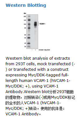 VCAM-1 Antibody recognizes endogenous levels of total VCAM-1 protein. This antibody cross-reacts with proteins of unknown origin 48 and 49 kDa.