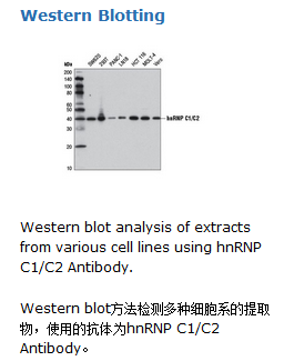 hnRNP C1/C2 能够检测内源性的hnRNP C1/C2总蛋白水平。该抗体不会与其他hnRNPCL1或 RALY蛋白发生交叉反应。该多克隆抗体是经由合成的围绕人 hnRNP C1/C2 蛋白近氨基端的肽段免疫动物而生产的。经过Protein A和亲和层析纯化。Heterogeneous nuclear ribonucleoprotein C1/C2 (hnRNP C1/C2)具有多种生物学功能如转录调控、DNA修复以及RNA加工路径。hnRNP C1/C2可作为mRNA加工路径中的“分子标尺”,其负责一旦新合成的转录本长度超过200-300个核苷酸,就会被从染色质模板上提交至mRNA输出路径中(1)。研究显示若没有hnRNP C1/C2, LCR相关的重塑复合物 (LARC)就不能与其靶DNA序列联系在一起(2,3)。LARC可以调控红细胞生成过程中β-globin基因的转录(2,3)。hnRNP C1/C2与其他hnRNP蛋白一样,能够与DNA损伤反应(DDR)蛋白相互作用(4)。hnRNP蛋白可以通过促进同源重组(HR)或非同源末端连接(NHEJ)从而调控双链断裂(DSB)修复(4)。hnRNP C1/C2可下调miR-21的表达,miR-21的表达能够导致多形性成胶质细胞瘤 (GBM)中程序性细胞死亡4 (PDCD4)的升高表达(5)。研究还发现hnRNP C1/C2沉默后可致使GBM细胞更易发生凋亡(5)。