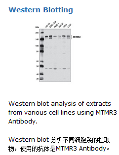 MTMR3 Antibody recognizes endogenous levels of total MTMR3 protein. This antibody also cross-reacts with a protein of unknown origin at 48 kDa.