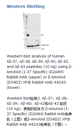 β-Amyloid (1-37 Specific) (D2A6H) Rabbit mAb 兔单抗能够检测内源性的β-淀粉样肽Aβ-37 亚型。该抗体不与其它β-淀粉样肽发生交叉反应。该单克隆抗体是由合成的人源β-淀粉样肽(1-37)C末端肽段免疫动物而制备的。β淀粉样蛋白(Amyloid β,Aβ)前体蛋白(Amyloid β precursor protein, APP)是分子量为100-140 kDa的跨膜糖蛋白,它拥有几个亚型(1)。APP的氨基酸序列中所包含的淀粉样蛋白域(A-β),能够通过两步蛋白裂解反应被释放出来(1)。释出的A-β片段在细胞外沉积积累,形成了阿尔茨海默病(Alzheimer's disease,AD)中淀粉样斑块的主要组成部分(1)。APP存在多个能够被磷酸化的位点,这些位点影响着蛋白本身的裂解和分泌过程(2-5)。细胞周期蛋白依赖性激酶介导的Thr688(对应于APP695亚型)磷酸化是细胞周期依赖的,在G2/M期达到峰值(4)。APP的Thr668磷酸化形式存在于成年大鼠大脑和相应的培养神经细胞及其分化细胞中(5,6)。