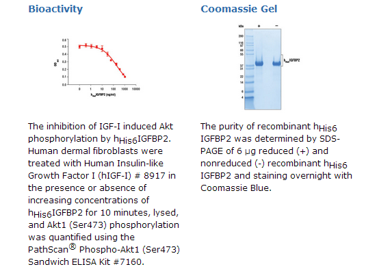 Recombinant Human His6IGFBP2 (hHis6IGFBP2) Glu40-Gln328 (Accession #NP_18065) was expressed in human 293 cells at Cell Signaling Technology.