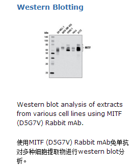 MITF (D5G7V) Rabbit mAb兔单抗可以识别内源性的总MITF蛋白。预测该抗体可以识别所有的MITF亚型。此单克隆抗体由合成肽段免疫动物产生,该肽段与人MITF蛋白的Gly335邻近氨基酸残基序列一致。眼球相关转录因子(MITF)是一个碱性螺旋-环-螺旋锌指转录因子,最广为人知是它在黑色素细胞,眼科和破骨细胞发展中的作用(1-3)。人体中MITF可以在黑色素瘤中发挥作用(4),MITF基因突变与2型Waardenburg 综合症,一种听觉-色素综合症表现为神经嵴源性干细胞发育缺陷(5)。MITF发现了至少12种亚型,表现出不同的细胞和组织特异性(6)。