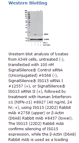 SignalSilence® ISG15 siRNA II from Cell Signaling Technology (CST) allows the researcher to specifically inhibit ISG15 expression using RNA interference, a method whereby gene expression can be selectively silenced through the delivery of double stranded RNA molecules into the cell. All SignalSilence® siRNA products from CST are rigorously tested in-house and have been shown to reduce target protein expression by western analysis.