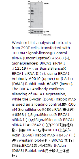 SignalSilence® BRCA1 siRNA II from Cell Signaling Technology (CST) allows the researcher to specifically inhibit BRCA1 expression using RNA interference, a method whereby gene expression can be selectively silenced through the delivery of double stranded RNA molecules into the cell. All SignalSilence® siRNA products from CST are rigorously tested in-house and have been shown to reduce target protein expression by western analysis.