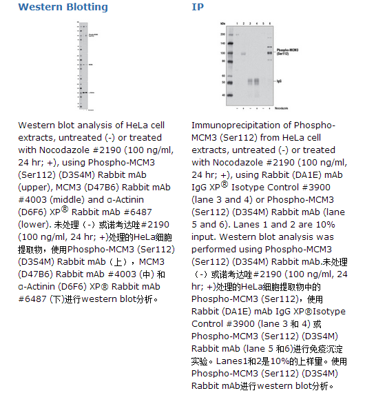 Phospho-MCM3 (Ser112) (D3S4M) Rabbit mAb可以识别Ser112被磷酸化的MCM3蛋白。抗体在处理间期和有丝分裂期细胞时能够检测到一条200 kDa的未知源性条带。Phospho-MCM3 (Ser112) (D3S4M) Rabbit mAb可以识别Ser112被磷酸化的MCM3蛋白。抗体在处理间期和有丝分裂期细胞时能够检测到一条200 kDa的未知源性条带。单克隆抗体由合成肽段免疫动物产生,该肽段与人MCM3的112位丝氨酸邻近残基序列一致。微染色体维持蛋白(MCM)2-7是一个由6个相关蛋白组成的家族,在DNA复制起始和延伸过程中是必须的。MCM2-7彼此结合形成异二聚体MCM复合物,被认为是DNA复制叉前进过程中的复制解旋酶(1-5).这个复合物是前复制复合物(pre-RC)的重要组成部分(1)。Cdc6和CDT1在有丝分裂/G1前期集合MCM复合物到起始识别复合物(ORC)形成pre-RC使DNA能够复制(2)。每个细胞周期中DNA只复制一次,因而帮助减少遗传变异和癌变细胞生长(3)。MCM2, MCM3, MCM4, 和MCM6亚基磷酸化可以调控MCM复合物活性起始DNA合成(6-8)。已经在体外证明,MCM3的112位丝氨酸被CDK1在有丝分裂后期/G1早期磷酸化会存进复合物形成染色质(8)。cdc7/dbf4磷酸化MCM2的139位丝氨酸能协助DNA复制(9)。DNA复制时MCM蛋白会被移除,通过抑制pre-RC再形成而保障染色质获得许可。研究表明MCM复合物可以保护复制叉的结构并在停滞后募集检验点蛋白协助重启复制(3,10)。