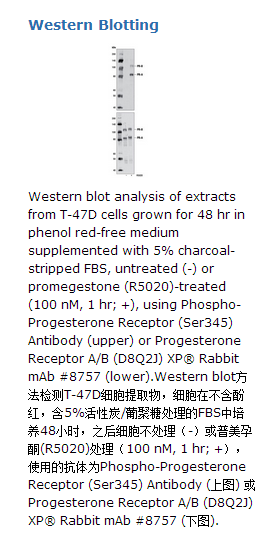 Phospho-Progesterone Receptor (Ser345) Antibody recognizes endogenous levels of progesterone receptor B (PR-B) and progesterone receptor A (PR-A) proteins only when phosphorylated at Ser345 and Ser181, respectively. This antibody does not cross-react with other progesterone receptor family members.