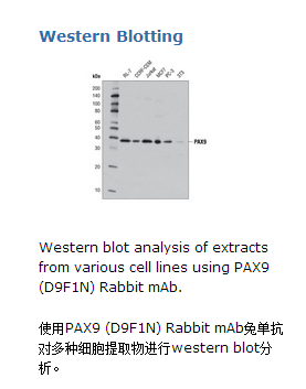 PAX9 (D9F1N) Rabbit mAb兔单抗可以识别内源性的总PAX9蛋白。单克隆抗体由合成肽段免疫动物产生,该肽段与人PAX9蛋白的Asp141邻近氨基酸残基序列一致。Paired box (PAX)蛋白是一组在动物发育过程中发挥了重要的及多样性作用的转录因子家族(1)。人和其他哺乳动物中发现了9个PAX蛋白(PAX1-9)。它们都含有氨基端“配对”结构域,包括了2个具有DNA结合活性的螺旋-转角-螺旋基序(2)。PAX蛋白,基于一个羧基端同源域和中心八肽区域的存在与否可以根据不同的结构分为4个不同的亚型(I-IV)。亚型I (PAX1 和9)包括八肽但是缺乏同源域;亚型II (PAX2, 5, 和 8)包括了八肽和被截短的同源域;亚型III (PAX3 和7)包括了八肽和完整的同源域;和亚型IV (PAX4 和6)包括了一个完整的同源域但是缺乏八肽结构(2)。PAX蛋白在发育过程中发挥了重要作用调控了胚胎模式和器官发生过程中的转录调控网络(3);PAX蛋白的一组亚型还在产后发育过程中发挥重要功能(4)。研究提示基因突变引发的PAX基因表达异常与多种癌症相关(1-3),部分亚型II和III被认为是癌症进程中可能的介导因子(2)。PAX9表达在咽弓间质(5,6),对牙和其他咽弓衍生物的胚胎发育至关重要(5,7)。敲除PAX9的小鼠会缺少咽囊结构(例如胸腺,甲状旁腺)(5),人体PAX9突变经常会导致先天性延迟发育不全综合症例如多数牙先天缺失和个别牙先天缺失(8,9)。PAX9可以和其他转录因子结合(例如MSX1)一调控BMP家族蛋白的表达(例如BMP4)以协调咽弓发育(10,11)。研究指出PAX9基因簇的扩增导致的PAX9的表达上调与肺癌的发生率增加相关(12)。