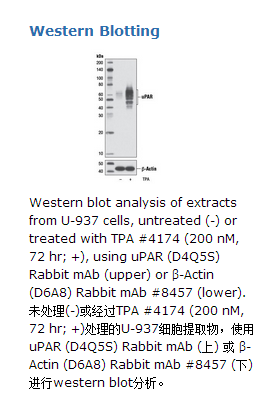 uPAR (D4Q5S) Rabbit mAb可以识别内源性总的uPAR蛋白。单克隆抗体由合成肽段免疫动物产生,该肽段与人uPAR蛋白Thr108附近氨基酸一致。人体尿激酶型纤溶酶原激活物受体(uPAR的)是一个55-65 kDa的,高度糖基化,GPI锚定的细胞表面受体(去糖基化蛋白质为35 kDa)(1-3)。它是纤溶酶原激活通路的核心成员。uPAR高亲和地与丝氨酸蛋白酶尿激酶型纤溶酶原激活剂(uPA)结合并在细胞表面上以空间限制的方式将纤溶酶原转化为活性形式的纤维蛋白溶酶(4)。纤维蛋白溶酶进一步激活uPA,这是由丝氨酸蛋白酶抑制剂所抑制的,例如纤溶酶原激活物抑制剂(5)。因此,uPAR在调控细胞外蛋白水解的过程中发挥了关键作用。此外,uPAR还调节了细胞增殖,黏附和运动(6,7)。研究表明多种癌细胞和组织中uPAR都是过表达的(8,9)。