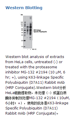 K63-linkage Specific Polyubiquitin (D7A11) Rabbit mAb (HRP 偶联)兔单抗识别Lys63位偶联的多泛素化链。这一抗体与单泛素和其他残基偶联的多泛素链无交叉反应。此单克隆抗体通过合成与人双泛素链的Lys63位分枝序列一致的肽段,免疫动物获得。CST公司的这个抗体通过它的胺基团与HRP的碳水化合物结合。预测此HRP偶联的抗体与未结合的K63-linkage Specific Polyubiquitin (D7A11) Rabbit mAb #5621一样的同种之间的交叉反应。泛素是一种保守的多肽单元,在泛素蛋白酶体通路中起重要作用。泛素能与许多细胞蛋白共价连接,并被26S蛋白酶降解。3种组分包含在靶蛋白泛素共价结合过程。泛素首先在具有泛素活化酶(UBE1 or E1)的硫酯复合物的形成中被活化。活化的泛素随后被转运到泛素载体蛋白(共价结合酶)E2,随后为了最后的靶蛋白赖氨酸残基的epsilon氨基,从E2到泛素连接酶E3(1-3)。泛素蛋白酶体通路在正常生物过程和疾病中广泛存在。一些蛋白,诸如IκB, p53, cdc25a, 和Bcl-2,是泛素-蛋白酶体过程的靶蛋白,并可以调节细胞周期进展、分化、细胞压力应答以及凋亡(4-7)。