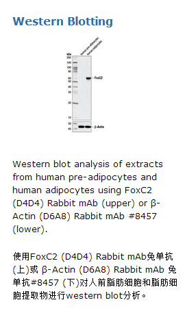 FoxC2 (D4D4) Rabbit mA兔单抗可以识别内源性FoxC2总蛋白水平。合成对应人FoxC2蛋白的Leu278及其邻近氨基酸序列的肽段免疫动物获得单抗。Forkhead box(Fox)蛋白是一类含有一个被称为Forkhead的翼状螺旋DNA结合结构域,在进化上保守的转录因子家族蛋白(1)。人体中,有超过40种已知的Fox蛋白家族成员,分为19个亚家族,在多样化和高度专业化的生物环境中参与调节了整个发育过程中的基因转录(2)。突变破坏Fox基因家族会随之产生多种人类疾病,包括免疫功能障碍,不育,言语/语言障碍和癌症(3,4)。脂肪生成过程会调控FoxC2和一些别的Fox转录因子的表达,提示它们参与了脂肪细胞分化(5)。白色脂肪组织(WAT)和棕色脂肪组织(BAT)过表达FoxC2的转基因小鼠模型表现出腹腔WAT减少的特点(6)。BAT特异基因Ucp1在这些转基因小鼠的腹腔脂肪中表达上调,导致它们具有了BAT的组化特征。这些证据提示FoxC2能发挥一种抗肥胖和饮食诱导的胰岛素抵抗的保护机制作用(6)。