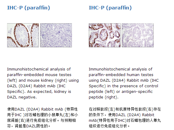 DAZL (D2A4) (IHC Specific) Rabbit mAb特异性识别内源性的总DAZL蛋白。单克隆抗体由合成肽段免疫动物产生,该肽段与人DAZL蛋白的羧基端邻近残基序列一致。DAZ (Deleted in Azoospermia)基因家族含有至少三个成员编码含有一个共同的RNA识别基序的RNA结合蛋白(1)。DAZ的常染色体同源蛋白,DAZL (DAZ-like)在生殖细胞中特异性表达,并对胚胎发育时和两性成体的生殖细胞成熟期的生殖细胞系发育限定至关重要(2,3)。DAZL可能会直接募集poly(A)结合蛋白(PABPs)以在生殖细胞发育时激活沉默mRNAs(2)。 人类不孕不育症中最常见的分子病因就是Y染色体上的DAZ 基因缺失(4,5).