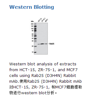 Rab25 (D3H4N) Rabbit mAb可以识别内源性总的Rab25蛋白。Rab11a, Rab11b, 和Rab25是小Ras-like GTPases 的Rab11超家族成员。不像广泛表达的Rab11,经典的Rab25表达似乎限制在胃肠粘膜,肾和肺组织(1)。Rab25可以和顶端回收囊泡联合帮助调控顶端囊泡示踪(2,3)。研究表明非典型Rab25的表达与多种癌症相关。Rab25表达增加和卵巢癌,乳腺癌中的侵袭性增长相关,Rab25可能会抑制细胞凋亡并促进癌细胞增殖以及通过调控囊泡运输和细胞活性来增进癌细胞侵润(4-7)。Rab25和β1整合素蛋白结合能促进囊泡介导的转运,这个转运过程将整合素转移到伪足端细胞膜,维持肿瘤细胞侵润端的功能(8)。相反地,已经报道的多种乳腺癌细胞中Rab25的表达缺失对于癌症的发病机理尚不明确(9)。