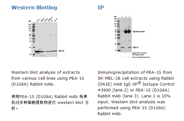 PEA-15 (D1G6A) Rabbit mAb可以识别内源性的PEA-15总蛋白该单克隆抗体采用合成的人PEA-15蛋白Leu60周围残疾相对应的肽段免疫动物产制备的。PEA-15是一个15 kDa的磷酸化蛋白,在星形胶质细胞、成纤维细胞以及组织(包括肺和眼)中表达(1)。研究证明,该蛋白协助调控细胞的生长、死亡,及葡萄糖利用(2-4)。PEA-15的氨基末端DED结构域介导它与FADD或Erk的结合,并进一步调控Erk和细胞凋亡信号通路。PEA-15可以在羧基末端的Ser104和Ser116两个丝氨酸残基处被磷酸化。在这些位点上的磷酸化调节其与Erk和FADD的结合(2,3)。