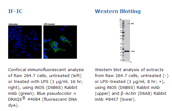 iNOS (D6B6S) Rabbit mAb recognizes endogenous levels of total iNOS protein. This antibody does not cross-react with other NOS proteins.