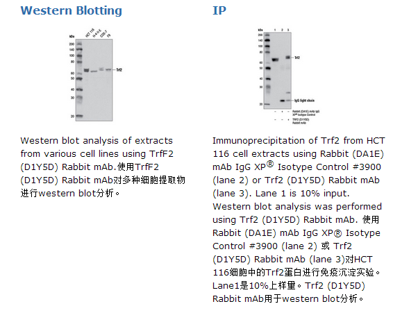 Trf2 (D1Y5D) Rabbit mAb可以识别内源性总的Trf2蛋白。单克隆抗体由合成重组人Trf2蛋白免疫动物产生。端粒,染色体的线性末端,折叠成T-loops以避免被细胞识别为DNA双链损伤(DSBs) (1)。端粒重复结合因子蛋白Trf1 和 Trf2与双链端粒结合以形成T-loops(2)。已经发现大量涉及DNA损伤反应的蛋白与Trf2在端粒区域结合(3)。有意思的是,Trf2可以短时间的位于DNA损伤诱导的DSBs,但是过表达Trf2会阻止ATM-依赖的信号通路(4)。体内发现了Trf2的Ser323磷酸化,但是没有发现该磷酸位点的上游激酶以及功能(50。