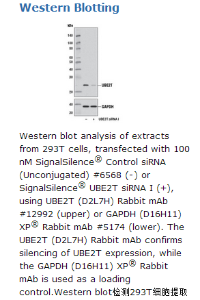 SignalSilence®UBE2T siRNA I from Cell Signaling Technology (CST) allows the researcher to specifically inhibit UBE2T expression using RNA interference, a method whereby gene expression can be selectively silenced through the delivery of double stranded RNA molecules into the cell. All SignalSilence®siRNA products from CST are rigorously tested in-house and have been shown to reduce target protein expression by western analysis。