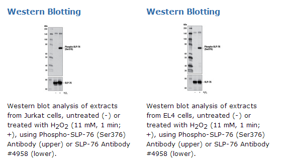 Polyclonal antibodies are produced by immunizing animals with a synthetic phosphopeptide corresponding to residues surrounding Ser376 of human SLP-76 protein. Antibodies are purified by protein A and peptide affinity chromatography.