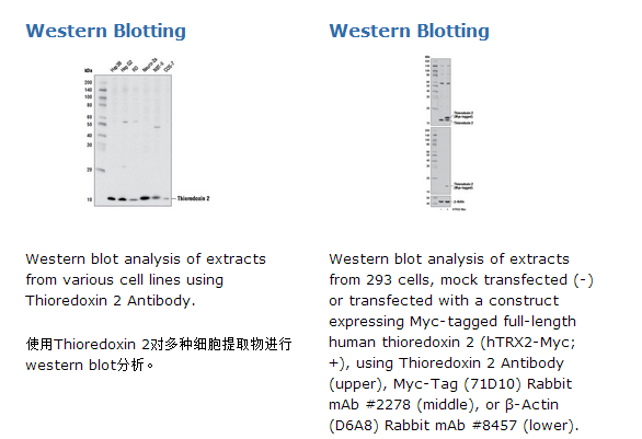 Thioredoxin 2 Antibody recognizes endogenous levels of total thioredoxin 2 protein. This antibody may cross-react with unidentified proteins from 60 kDa to 140 kDa.