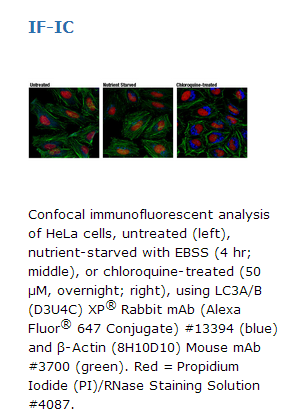 LC3A/B (D3U4C) XP®Rabbit mAb (Alexa Fluor®647 Conjugate) recognizes endogenous levels of total LC3A and LC3B proteins.