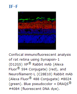 Synapsin-1 (D12G5) XP®Rabbit mAb (Alexa Fluor®594 Conjugate) detects endogenous levels of total synapsin protein. The antigen is 100% conserved between human synapsin-1a and synapsin-1b.