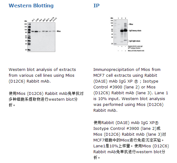Mios (D12C6) Rabbit mAb兔单抗可以识别内源性总的Mios蛋白。单克隆抗体由合成肽段免疫动物产生,该肽段与人Mios的Leu730邻近残基序列一致。mTORC1激酶复合物在细胞生长调节过程中发挥了关键作用(1,2)。mTORC1活性能被能能量水平,生长因子和氨基酸水平调节(3,4)。4个相关的GTPases (RagA, RagB, RagC, 和 RagD)可以和mTORC1中的raptor结合,这是氨基酸信号引起的mTORC1活化的充分必要条件(1,2)。GAP 针对Rags (GATOR) 复合物的活性通过和Rag GTPases相互作用而实现,这个复合物由一组蛋白亚复合物构成(5)。GATOR1亚复合物包括蛋白DEPDC5, Nprl2 和Nprl3,它是一个RagA和RagB GTPase激活蛋白(GAP)能负调控mTORC1信号。相反,GATOR2亚复合物(包括Mios, WDR24, WDR59, Seh1L 和 Sec13)则是mTORC1的正向调控因子(5)。mTORC1激酶复合物在细胞生长调节过程中发挥了关键作用(1,2)。mTORC1活性能被能能量水平,生长因子和氨基酸水平调节(3,4)。4个相关的GTPases (RagA, RagB, RagC, 和 RagD)可以和mTORC1中的raptor结合,这是氨基酸信号引起的mTORC1活化的充分必要条件(1,2)。GAP 针对Rags (GATOR) 复合物的活性通过和Rag GTPases相互作用而实现,这个复合物由一组蛋白亚复合物构成(5)。GATOR1亚复合物包括蛋白DEPDC5, Nprl2 和Nprl3,它是一个RagA和RagB GTPase激活蛋白(GAP)能负调控mTORC1信号。相反,GATOR2亚复合物(包括Mios, WDR24, WDR59, Seh1L 和 Sec13)则是mTORC1的正向调控因子(5)。