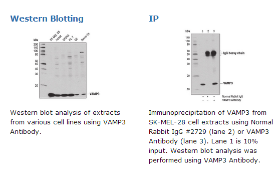 VAMP3 recognizes endogenous levels of total VAMP3 protein. This antibody does not cross-react with VAMP1 or VAMP2 proteins.