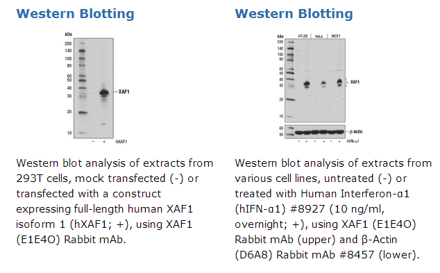 XAF1 (E1E4O) Rabbit mAb recognizes endogenous levels of total XAF1 protein.