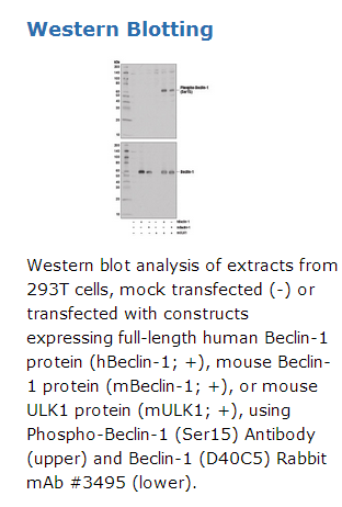Phospho-Beclin-1 (Ser15) Antibody recognizes transfected levels of Beclin-1 protein only when phosphorylated at Ser15 (which corresponds to Ser14 in mouse).