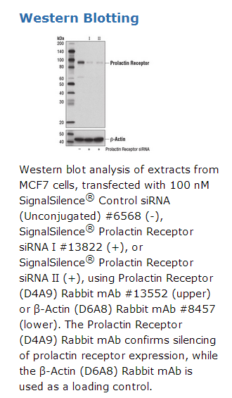 SignalSilence®Prolactin Receptor siRNA II from Cell Signaling Technology (CST) allows the researcher to specifically inhibit prolactin receptor expression using RNA interference, a method whereby gene expression can be selectively silenced through the delivery of double stranded RNA molecules into the cell. All SignalSilence®siRNA products from CST are rigorously tested in-house and have been shown to reduce target protein expression by western analysis.