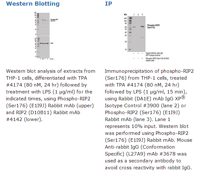 Phospho-RIP2 (Ser176) (E1I9J) Rabbit mAb recognizes endogenous levels of RIP2 protein only when phosphorylated at Ser176. This antibody also cross-reacts with unidentified proteins of approximately 25 kDa and 38 kDa in some cell lines.