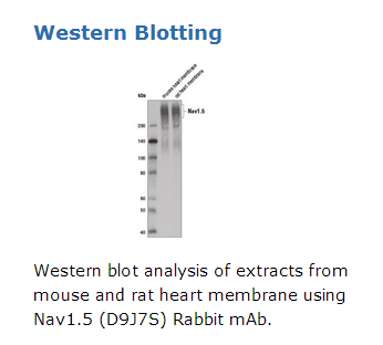 Nav1.5 (D9J7S) Rabbit mAb recognizes endogenous levels of total Nav1.5 protein. This antibody also recognizes bands at 190 and 135 kDa that are likely degradation products of Nav1.5.