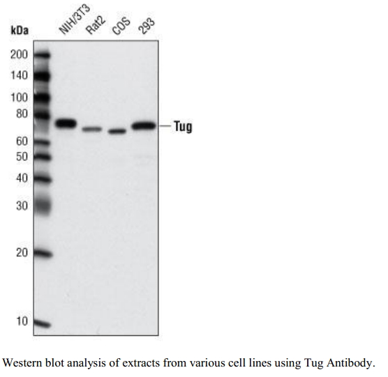 Polyclonal antibodies are produced by immunizing animals with a synthetic peptide corresponding to amino acids around residue Val542 of human Tug. Antibodies are purified by Protein A and peptide affinity chromatography.