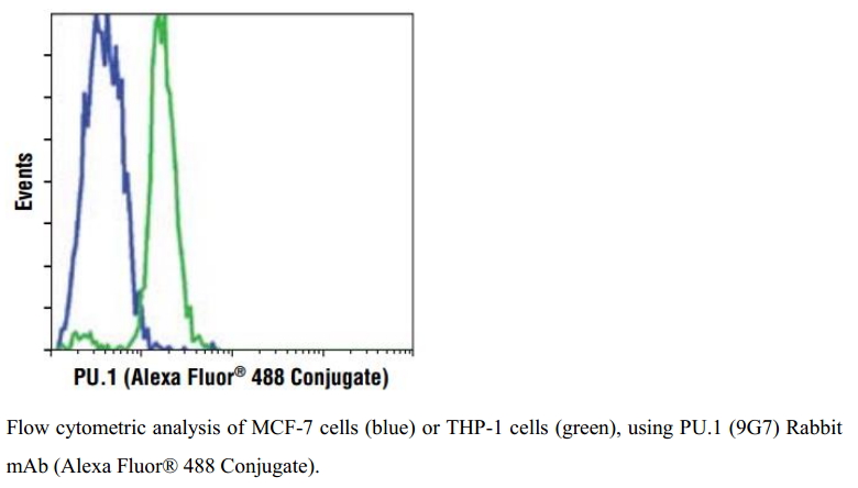 PU.1 (9G7) Rabbit mAb (Alexa Fluor® 488 Conjugate) 能够检测内源PU.1蛋白总体水平。此抗体不与Ets家族蛋白的其它成员交叉反应。CST公司生产的此抗体与Alexa Fluor® 488荧光染料偶联,并通过人源细胞的流式细胞仪的测试。未偶联的抗体#2258与人源和小鼠的 PU.1 蛋白反应。正如预期,PU.1 (9G7) Rabbit mAb (Alexa Fluor® 488 Conjugate) 也能识别这些物种中的PU.1蛋白。