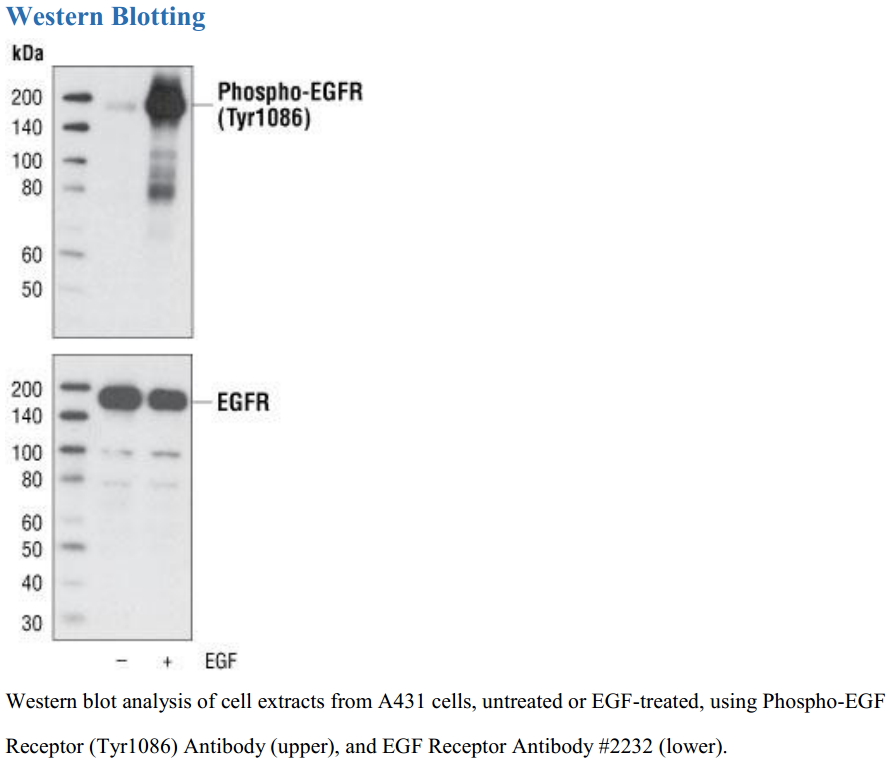 磷酸化的EGFR (Tyr1086)的抗体仅在Tyr1086被磷酸化后才能检测到内源EGFR的存在。本抗体与EGFR家族的其它蛋白没有交叉反应。多克隆抗体通过用多肽免疫动物得到,该磷酸化多肽是根据人的EGFR蛋白Tyr1086附近的氨基酸序列合成的。抗体经过protein A和亲和层析纯化。