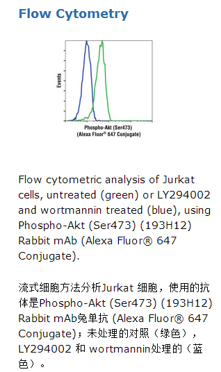 Phospho-Akt (Ser473) (193H12) Rabbit mAb (Alexa Fluor® 647 Conjugate) 能够检测内源性的丝氨酸(473位点)磷酸化的AKT蛋白。该单克隆抗体是由采用合成的与鼠源AKT蛋白丝氨酸(473位)周围序列相对应的磷酸肽免疫动物而生产的。抗体按照2-6的最佳F /P比例结合到Alexa Fluor®647上。Alexa Fluor®647染料可被红光达到最大激发(如633 nm的氦氖激光)。Alexa Fluor®647染料标记的抗体产生明亮的远红外荧光发射,峰值为665nm。Cell Signaling Technology生产的抗体用 Alexa Fluor® 647荧光染料标记的,并在内部对人类细胞直接进行了流式细胞仪的分析验证。未标记的Phospho-Akt (Ser473) (193H12) Rabbit mAb #4058 与人源,小鼠和大鼠来源的Phospho-Akt (Ser473)反应。CST公司认为Phospho-Akt (Ser473) (193H12) Rabbit mAb (Alexa Fluor® 647 Conjugate) 也可以识别上述种属的Phospho-Akt (Ser473)。