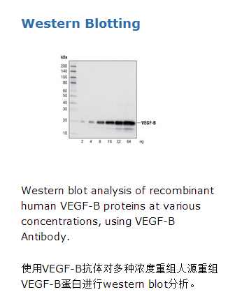 VEGF-B Antibody detects recombinant human VEGF-B protein at various concentrations. This antibody does not cross-react with other VEGF family members.