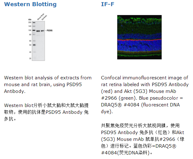 PSD95 Antibody 兔多抗识别内源性的PSD95 总蛋白。该多克隆抗体由合成的人类PSD95蛋白相应氨基酸序列对应肽段免疫动物而制成。该抗体使用蛋白A和多肽亲和层析纯化而得。突触后密集区蛋白95(Postsynaptic Density protein 95,PSD95) 是一种膜相关鸟苷酸激酶(PSD - MAGUK)蛋白质PSD亚族的成员。该家族成员由三个PDZ结构域后的可变N末端,一个SH3结构域和一个无效的鸟苷酸激酶(GK)结构域组成。PSD95是一种脚手架蛋白,参与突触后密集复合物的装配和功能。(1,2)。PSD95通过间接方式参与AMPA受体在突触的定位,涉及Stargazin和相关的跨膜AMPA受体调节蛋白(TARPS)(3)。PSD95与经验依赖的可塑性有关,在学习中起着不可或缺的作用(4)。PSD95基因突变与自闭症有关(5)。