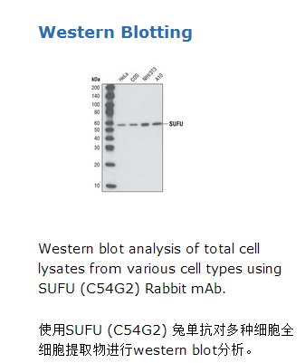 此SUFU (C54G2) Rabbit mAb兔单抗识别内源性的总SUFU 蛋白。此单克隆抗体是通过一种合成的肽段去免疫动物产生。这种合成的肽段与人SUFU蛋白邻近Leu458氨基酸残基序列一致。
